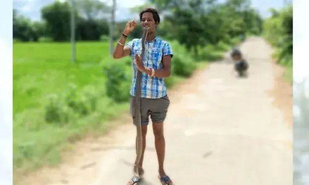 ತೆಲಂಗಾಣದ ಕಾಮರೆಡ್ಡಿ ಜಿಲ್ಲೆಯ ಬನ್ಸವಾಡ ಮಂಡಲದ ದೇಸಾಯಿಪೇಟ್ ಗ್ರಾಮದ ಹಾವಾಡಿಗನೊಬ್ಬನ ಮಗ ಶಿವ ಎಂಬಾತ ಗ್ರಾಮದ ಕಾಲೋನಿಗೆ ಪ್ರವೇಶಿಸಿದ 6 ಅಡಿಯ ನಾಗರ ಹಾವನ್ನು ಹಿಡಿದು ಗ್ರಾಮದಿಂದ ಹೊರಗೆ ಬಿಡಲು ತೆಗೆದುಕೊಂಡು ಹೋಗುವ ವೇಳೆ ಹುಚ್ಚು ಸಾಹಸವನ್ನು ಮಾಡಿದ್ದಾನೆ.