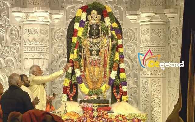 ಪ್ರಧಾನಿ ನರೇಂದ್ರ ಮೋದಿ ಅವರು ಧಾರ್ಮಿಕ ವಿಧಿ ವಿಧಾನಗಳ ಮೂಲಕ ಇಂದು ಮಧ್ಯಾಹ್ನ 12:29:03ರಿಂದ 12.30:35 ರವರೆಗೆ ಅಭಿಜಿತ್ ಶುಭ ಮುಹೂರ್ತದಲ್ಲಿ ಅಯೋಧ್ಯೆಯ ರಾಮಮಂದಿರದಲ್ಲಿ ಬಾಲ ರಾಮ ಮೂರ್ತಿಯ ಪ್ರಾಣ ಪ್ರತಿಷ್ಠಾಪನೆಯನ್ನು ನೆರವೇರಿಸಿದರು. ‘ಆರತಿ’ ವೇಳೆ ಅಯೋಧ್ಯೆಯ ಮೇಲೆ ಸೇನಾ ಹೆಲಿಕಾಪ್ಟರ್ಗಳಿಂದ ಪುಷ್ಪವೃಷ್ಟಿ ಸುರಿಸಲಾಯಿತು. ರಾಮ ಜನ್ಮಭೂಮಿ ದೇವಸ್ಥಾನದಲ್ಲಿ ಆರತಿ ಸಮಯದಲ್ಲಿ ಕಲಾವಿದರು ದೇವಾಲಯದ ಆವರಣದಲ್ಲಿ ವಿವಿಧ ಭಾರತೀಯ ಸಂಗೀತ ವಾದ್ಯಗಳನ್ನು ನುಡಿಸಿದರು.