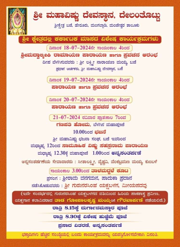 ಬoದ್ಯೋಡು: ಬಜೆ ದೇಲಂತೊಟ್ಟು ಶ್ರೀ ಮಹಾವಿಷ್ಣು ದೇವಸ್ಥಾನದಲ್ಲಿ ಕರ್ಕಾಟಕ ಮಾಸದ ವಿಶೇಷ ಕಾರ್ಯಕ್ರಮ ಇಂದಿನಿoದ ಜುಲೈ ೨೧ರ ತನಕ ನಡೆಯಲಿದೆ. ಇಂದು [೧೮-೭-೨೦೨೪] ಸಂಜೆ ೪ರಿಂದ ಶ್ರೀಮದ್ವಾಲ್ಮೀಕಿ ರಾಮಾಯಣ ಪಾರಾಯಣ ಹಾಗೂ ಪ್ರವಚನ ಆರಂಭಗೊಳ್ಳಲಿದೆ. ಶ್ರೀ ಕ್ಷೇತ್ರದ ಪ್ರಧಾನ ಅರ್ಚಕ ಲಕ್ಷ್ಮಿ ನಾರಾಯಣ ಮಯ್ಯ ಬಜೆ ದೀಪ ಬೆಳಗಿಸಿ ಚಾಲನೆ ನೀಡುವರು. ೧೯ಮತ್ತು ೨೦ರಂದು ಸಂಜೆ ೪ರಿಂದ ಪಾರಾಯಣ ಹಾಗೂ ಪ್ರವಚನ ನಡೆಯಲಿದೆ. ೨೧ರಂದು ಪ್ರಾತಕಾಲ ೭ರಿಂದ ಗಣಪತಿ ಹೋಮ, ಬೆಳಿಗಿನ ಮಹಾಪೂಜೆ, ೧೦ರಿಂದ ಭಜನೆ, ಮಧ್ಯಾಹ್ನ ೧೨ರಿಂದ ಸಾಮೂಹಿಕ ವಿಷ್ಣು ಸಹಸ್ರನಾಮ ಪಾರಾಯಣ, ೧೨.೩೦ಕ್ಕೆ ಮಹಾಪೂಜೆ, ಅನ್ನಸಂತರ್ಪಣೆ, ಸಂಜೆ ೩ರಿಂದ ಮೀಯಪದವು ಶ್ರೀ ಗುರುನರಸಿಂಹ ಯಕ್ಷ ಬಳಗದವರಿಂದ ಶ್ರೀರಾಮ ವನಗಮನ, ಪಾದುಕಾ ಪ್ರದಾನ ತಾಳಮದ್ದಳೆ ಕೂಟ, ಇದೇ ಸಂದರ್ಭದಲ್ಲಿ ಯಕ್ಷಗಾನ ಕಲಾವಿದ ತಾಡ ಗೋಪಾಲಕೃಷ್ಣ ಮಯ್ಯ ರವರಿಗೆ ಗೌರ್ವಾರ್ಪಣೆ ನಡೆಯಲಿದೆ. ರಾತ್ರಿ ೮.೧೫ಕ್ಕೆ ದುರ್ಗಾನಮಸ್ಕಾರ ಪೂಜೆ, ರಾತ್ರಿ ೮.೩೦ಕ್ಕೆ ವಿಶೇಷ ಹುಣ್ಣಿಮೆ ಪೂಜೆ, ಪ್ರಸಾದ ವಿತರಣೆ, ಅನ್ನಸಂತರ್ಪಣೆ ನಡೆಯಲಿದೆ.