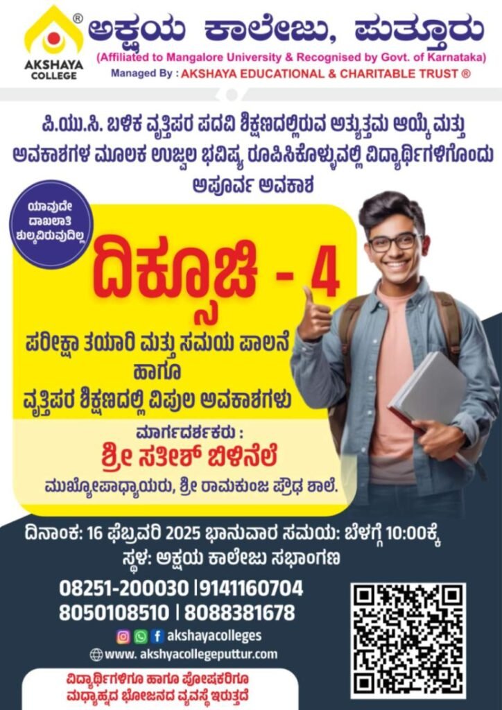 ಪುತ್ತೂರಿನಲ್ಲಿ ವಿನೂತನ ಪದವಿ ಕೋರ್ಸುಗಳನ್ನು ಪರಿಚಯಿಸಿ ಶೈಕ್ಷಣಿಕ ಕ್ಷೇತ್ರದೊಂದಿಗೆ ಕ್ರೀಡಾ ಹಾಗೂ ಸಾಂಸ್ಕೃತಿಕ ಕ್ಷೇತ್ರದಲ್ಲೂ ಹಲವು ಸಾಧನೆ ಮಾಡುತ್ತಿರುವ ಸಂಪ್ಯದ ಅಕ್ಷಯ ಕಾಲೇಜಿನಲ್ಲಿ ದಿನಾಂಕ 16 ಫೆಬ್ರವರಿ ಭಾನುವಾರ ಬೆಳಿಗ್ಗೆ 10. ಗಂಟೆಯಿoದ 12.30 ರ ವರೆಗೆ “ದಿಕ್ಸೂಚಿ-4” ಕಾರ್ಯಕ್ರಮವನ್ನು ಆಯೋಜಿಸಲಾಗಿದೆ.