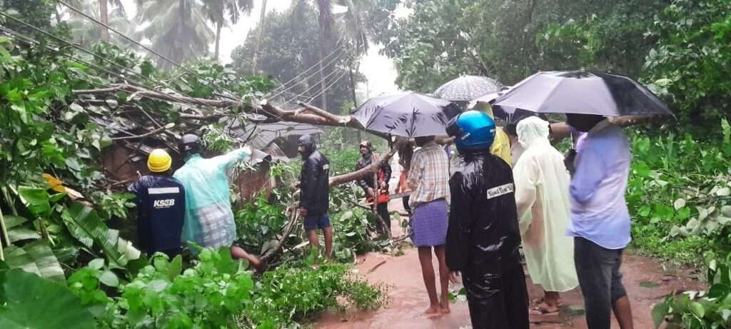ಉಪ್ಪಳ:  ಭಾರೀ ಜೋರಾದ ಮಳೆ, ಗಾಳಿಗೆ ಮರಗಳು ಮುರಿದು ಬಿದ್ದು ವಿದ್ಯುತ್ ಕಂಬ ಹಾನಿಗೀಡಾಗಿ  ಸಂಚಾರಕ್ಕೆ ಅಡಚಣೆ ಉಂಟಾದ ಘಟನೆ  ನಿನ್ನೆ ಸಂಜೆ ಮಂಗಲ್ಪಾಡಿಯ ಪ್ರತಾಪನಗರದಲ್ಲಿ  ನಡೆದಿದೆ. ಪ್ರತಾಪ ನಗರದ ಪ್ರಧಾನ ರಸ್ತೆಯಲ್ಲಿ ಜುಲೈ 14ರಂದು ಸಂಜೆ ಖಾಸಗಿ ಹಿತ್ತಿಲಿನಲ್ಲಿದ್ದ ಬೃಹತ್ ಮರ ಪರಿಸರದ ವಿದ್ಯುತ್ ತಂತಿಗೆ ಹಾಗೂ ಸಮೀಪದ ದೇವದಾಸ್ ಶೆಟ್ಟಿ ಎಂಬವರ ಕ್ವಾಟ್ರರ್ಸ್ಗೆ ಮುರಿದು ಬಿದ್ದಿದೆ. ಇದರಿಂದ ಕ್ವಾಟ್ರರ್ಸ್ನ ಹೆಂಚು, ಪಕ್ಕಾಸು ಹಾಬಿಗೊಂಡಿದೆ. ಅಲ್ಲದೆ ವಿದ್ಯುತ್  ತಂತಿ ಸಡಿಲಗೊಂಡು ನೆಲಕ್ಕೆ ಸ್ಪರ್ಶಿಸುವ ಹಂತಕ್ಕೆ ತಲುಪಿದ್ದು,  ಇದನ್ನು ಅರಿತ ಸ್ಥಳೀಯ ಯುವಕರು ಕೂಡಲೇ  ವಿದ್ಯುತ್ ಇಲಾಖೆಗೆ ತಿಳಿಸಿ ವಿದ್ಯುತ್‌ನ್ನು ವಿಚ್ಚೆದಿಸಲಾಗಿದೆ.  ಇದರಿಂದ ಸಂಭವಿಸ ಬಹುದಾದ ಅಪಾಯ ತಪ್ಪಿದೆ. ಬಳಿಕ ವಿದ್ಯುತ್ ಸಿಬ್ಬಂದಿಗಳು ಹಾಗೂ ಊರಿನ ಯುವಕರು ಮರವನ್ನು ಕಡಿದು ಕ್ಷಣಾರ್ಥದಲ್ಲಿ ತೆರವುಗೊಳಿಸಿ ವಾಹನ ಸಂಚಾರಕ್ಕೆ ದಾರಿ  ಮಾಡಿಕೊಟ್ಟರು. ಇದಾದ ಕೆಲವೇ ನಿಮಿಷದಲ್ಲಿ ಇದೇ ಪರಿಸರದಲ್ಲಿ ಮತ್ತೊಂದು ಮರ ಬಿದ್ದಿದೆ. ಬೆಳಿಗ್ಗೆ ಇಲ್ಲಿನ ಒಳ ರಸ್ತೆಯಲ್ಲಿ ಮರವೊಂದು ಬಿದ್ದು ವಿದ್ಯುತ್ ಕಂಬ ಹಾನಿಗೊಂಡಿದೆ. ಸ್ಥಳೀಯ ಯುವಕರು ಹಾಗೂ ಉಪ್ಪಳ ವಿದ್ಯುತ್ ಕಚೇರಿ ಸಿಬ್ಬಂದಿಗಳು ನಡೆಸಿದ ಕಾರ್ಯಾಚರಣೆಯಿಂದ ಸಂಭವಿಸಬಹುದಾದ ಅಪಾಯ ತಪ್ಪಿದಿದೆ.