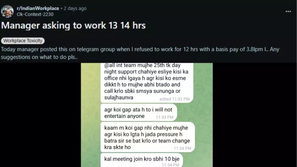 ಹೌದು, ರೆಡ್ಡಿಟ್ ಬಳಕೆದಾರರೊಬ್ಬರು ತಮ್ಮ ಮ್ಯಾನೇಜರ್ ಜೊತೆಗೆ ನಡೆಸಿದ ಮಾತುಕತೆಯ ಸ್ಕ್ರೀನ್‌ಶಾಟ್ ಶೇರ್ ಮಾಡಿಕೊಂಡಿದ್ದು ಇದರಲ್ಲಿ ಕಡಿಮೆ ಸಂಬಳವಾದರೂ ಕೆಲಸದ ಸಮಯ ಹೆಚ್ಚಳ ಮಾಡಿರುವುದನ್ನು ಕಾಣಬಹುದು. ತಮ್ಮ ಬಾಸ್‌ ಕಳುಹಿಸಿದ ಸಂದೇಶದ ಸ್ಕ್ರೀನ್‌ ಶಾಟ್‌ ಜೊತೆಗೆ ‘ನಾನು ವರ್ಷಕ್ಕೆ 3.8 ಲಕ್ಷ ಮೂಲ ವೇತನ ಪಡೆಯುತ್ತಿದ್ದು, ನನ್ನ ಬಾಸ್‌ ದಿನಕ್ಕೆ 12 ಗಂಟೆಗಳ ಕಾಲ ಕೆಲಸ ಮಾಡುವಂತೆ ಹೇಳಿದ್ದಾರೆ. ನಾನು ಇದನ್ನು ನಿರಾಕರಿಸಿದಾಗ ಇಂದು ಮ್ಯಾನೇಜರ್ ಇದನ್ನು ಟೆಲಿಗ್ರಾಮ್ ನಲ್ಲಿ ಪೋಸ್ಟ್ ಮಾಡಿದ್ದು, ನನಗೆ ಮುಂದೆ ಏನು ಮಾಡಬೇಕು ಎಂಬುದರ ಕುರಿತು ಯಾರಾದರೂ ಸಲಹೆ ನೀಡಿ ಪ್ಲೀಸ್‌ ಎಂದು ಬರೆದುಕೊಂಡಿದ್ದಾರೆ.
