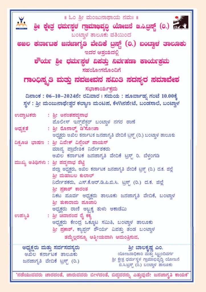 ಬಂಟ್ವಾಳ : ಶ್ರೀ ಕ್ಷೇತ್ರ ಧರ್ಮಸ್ಥಳ ಗ್ರಾಮಾಭಿವೃದ್ಧಿ ಯೋಜನೆ ಬಿಸಿ ಟ್ರಸ್ಟ್ (ರಿ.)ಬಂಟ್ವಾಳ, ವತಿಯಿಂದ ,ಅಖಿಲ ಕರ್ನಾಟಕ ಜನಜಾಗೃತಿ ವೇದಿಕೆ (ರಿ.) ಬಂಟ್ವಾಳ, ಇದರ ಆಶ್ರಯದಲ್ಲಿ ಧರ್ಮಸ್ಥಳ ಶೌರ್ಯ ವಿಪತ್ತು ನಿರ್ವಹಣಾ ಘಟಕ ಬಂಟ್ವಾಳ ಇದರ ಸಹಯೋಗದೊಂದಿಗೆ  *ಗಾಂಧಿ ಸ್ಮೃತಿ ಮತ್ತು ನವಜೀವನ ಸಮಿತಿ ಸದಸ್ಯರ ಸಮಾವೇಶ* ದಿನಾಂಕ  6-10-2024 ನೇ ಆದಿತ್ಯವಾರ ಬೆಳಿಗ್ಗೆ ಗಂಟೆ 9 ರಿಂದ ಶ್ರೀ ಮಂಜುನಾಥೇಶ್ವರ ಕಲ್ಯಾಣ ಮಂಟಪ ಬಂಟ್ವಾಳದಲ್ಲಿ ಜರಗಲಿರುವುದು.