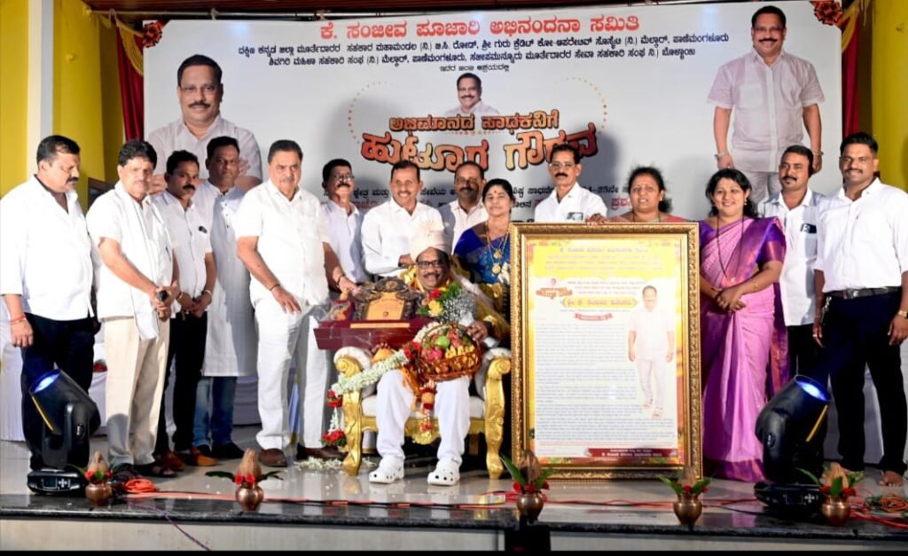 ಬಂಟ್ವಾಳ: ದ.ಕ.ಜಿಲ್ಲಾ ರಾಜ್ಯೋತ್ಸವ ಪ್ರಶಸ್ತಿ ಹಾಗೂ ಸ್ವಸ್ತಿ ಸಿರಿ ರಾಜ್ಯ ಪ್ರಶಸ್ತಿ ಪುರಸ್ಕೃತ ಸಹಕಾರಿ-ಸಮಾಜ ಸೇವಾ ಕ್ಷೇತ್ರದ ಸಾಧಕ ಕೆ.ಸಂಜೀವ ಪೂಜಾರಿ ಅವರಿಗೆ ಕೆ.ಸಂಜೀವ ಪೂಜಾರಿ ಅಭಿನಂದನಾ ಸಮಿತಿ, ಬಿ.ಸಿ.ರೋಡಿನ ದ.ಕ.ಜಿಲ್ಲಾ ಮೂರ್ತೆದಾರರ ಸಹಕಾರ ಮಹಾಮಂಡಲ, ಮೆಲ್ಕಾರಿನ ಶ್ರೀಗುರು ಕ್ರೆಡಿಟ್ ಕೋ-ಆಪರೇಟಿವ್ ಸೊಸೈಟಿ, ಶಿವಗಿರಿ ಮಹಿಳಾ ಸಹಕಾರಿ ಸಂಘ ಹಾಗೂ ಸಜೀಪಮುನ್ನೂರು ಮೂರ್ತೆದಾರರ ಸೇವಾ ಸಹಕಾರಿ ಸಂಘದ ಆಶ್ರಯದಲ್ಲಿ ರವಿವಾರ ಸಜೀಪಮೂಡ ಸುಭಾಷ್ನಗರ ಶ್ರೀಗುರು ಕಲ್ಯಾಣ ಮಂಟಪದಲ್ಲಿ ನಡೆದ ಸಮಾರಂಭದಲ್ಲಿ ಅಭಿಮಾನದ ಸಾಧಕನಿಗೆ ಹುಟ್ಟೂರ ಗೌರವ ನೀಡಿ ಸಮ್ಮಾನಿಸಲಾಯಿತು.