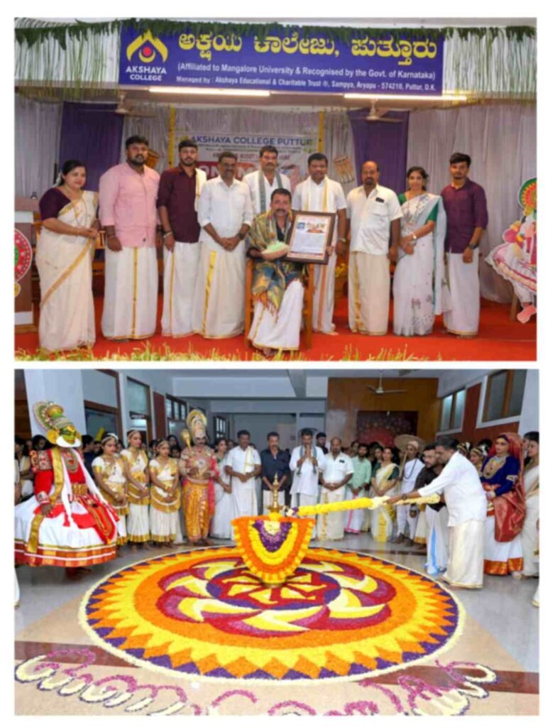ಸಂಪ್ಯದಲ್ಲಿ ಅಕ್ಷಯ ಎಜ್ಯುಕೇಶನ್ ಆಂಡ್ ಚಾರಿಟೇಬಲ್ ಟ್ರಸ್ಟ್ನಡಿಯಲ್ಲಿ ಕಾರ್ಯಾಚರಿಸುತ್ತಿರುವ ಅಕ್ಷಯ ಕಾಲೇಜಿನಲ್ಲಿ ಸೆ.೨೧ ರಂದು ಸಂಭ್ರಮದ ಓಣಂ ಹಬ್ಬಾಚರಣೆಯಾಗಿದ್ದು, ಈ ಹಬ್ಬಾಚರಣೆಯ ಪ್ರಯುಕ್ತ ಕಾಲೇಜು ಪ್ರವೇಶ ದ್ವಾರ ಬಳಿ ನಿರ್ಮಿಸಲಾದ ‘ಪೂಕಳಂ’ ದೀಪ ಬೆಳಗಿಸಿ ಉದ್ಘಾಟಿಸಿ ಅವರು ಮಾತನಾಡಿದರು. ಈ ಹಬ್ಬವು ಸಿಹಿ, ಉಪ್ಪು, ಖಾರ, ಹುಳಿ, ಕಷಾಯ ಹೀಗೆ ಆರು ತರಹದ ರಸಗಳು ಸೇರಿ ಆರೋಗ್ಯ ಸಂಪೂರ್ಣತೆಯನ್ನು ಪಡೆಯುತ್ತದೆ ಎಂಬುದು ಇತಿಹಾಸ ಹೇಳುತ್ತದೆ. ಹೇಗೆ ಶಾಲೆಯಲ್ಲಿ ಎಲ್ಲರೂ ಒಂದೇ ಎಂಬ ಭಾವನೆಯಿಂದ ಸಮವಸ್ತ್ರವಿದೆಯೋ ಹಾಗೆಯೇ ಈ ಓಣಂ ಹಬ್ಬದಲ್ಲಿ ಕೂಡ ಎಲ್ಲರೂ ಒಂದೇ ತೆರನಾದ ಸಮವಸ್ತ್ರವನ್ನು ಧರಿಸಿ ನಾವೆಲ್ಲರೂ ಒಂದೇ ಎಂಬ ಭಾವನೆಯನ್ನು ಎತ್ತಿ ತೋರಿಸಿಕೊಡುತ್ತದೆ ಎಂದರು.