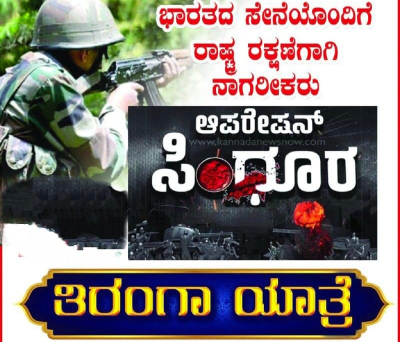 ಸಕಲೇಶಪುರ: ದಿನಾಂಕ 23.5.2025 ಶುಕ್ರವಾರ ಸಮಯ 10 ಗಂಟೆಗೆ ಭಾರತ ಸೇನೆಯೊಂದಿಗೆ ರಾಷ್ಟ್ರ ರಕ್ಷಣೆಗಾಗಿ ನಾಗರಿಕರು ಸಕಲೇಶ್ವರ ಸ್ವಾಮಿ ದೇವಸ್ಥಾನದಿಂದ ಮುಖ್ಯ ರಸ್ತೆ ಬಸವೇಶ್ವರ ಪುತ್ಕಳಿ ಮಾರ್ಗವಾಗಿ ಹಳೇ ಬಸ್ ನಿಲ್ದಾಣವರೆಗೆ. ಆಪರೇಷನ್ ಸಿಂಧೂರ ತಿರಂಗ ಯಾತ್ರೆ ನಡೆಸಲಿದ್ದಾರೆ.