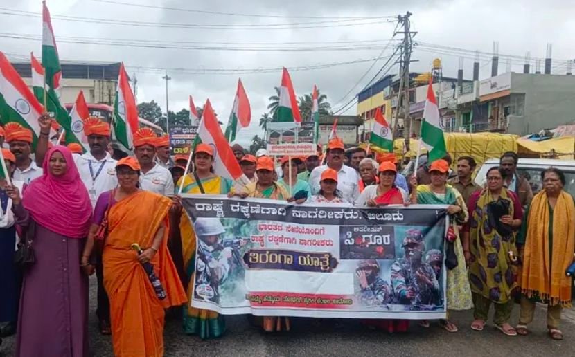 ಆಲೂರು: ಆಪರೇಷನ್ ಸಿಂಧೂರ ಯಶಸ್ವಿಯಾದ ಹಿನ್ನೆಲೆಯಲ್ಲಿ ದೇಶ  ರಕ್ಷಣೆಗಾಗಿ ನಾಗರಿಕರು ಎಂಬ ದ್ವೇಯದೊಂದಿಗೆ ಶಾಸಕ ಸಿಮೆಂಟ್ ಮಂಜು ಹಾಗೂ ಮಠಾಧೀಶ್ವರರ ನೇತೃತ್ವದಲ್ಲಿ ಕೆ. ಇ.ಬಿ ಸರ್ಕಲ್ ನಿಂದ ವೀರಶೈವ ಕಲ್ಯಾಣ ಮಂಟಪದವರೆಗೂ ಪಟ್ಟಣದ ಪ್ರಮುಖ ಬೀದಿಗಳಲ್ಲಿ ಒಂದು ಕಿಲೋಮೀಟರ್ ಉದ್ದದ ತಿರಂಗ ಬಾವುಟವನ್ನು ಮಾಜಿ ಸೈನಿಕರು, ವಿದ್ಯಾರ್ಥಿಗಳು, ಸಂಘ ಸಂಸ್ಥೆಗಳ ಮುಖಂಡರು ಮಠಾಧೀಶರು,ಬಾವುಟವನ್ನು ಹಿಡಿದು ಮೆರವಣಿಗೆ ನಡೆಸಿದರು.