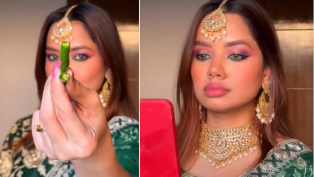 ಈ ವಿಡಿಯೋವನ್ನು ಶುಭಂಗಿ ಆನಂದ್ ಹೆಸರಿನ ಖಾತೆಯಲ್ಲಿ ಶೇರ್ ಮಾಡಲಾಗಿದೆ. ಈ ವಿಡಿಯೋದಲ್ಲಿ ಯುವತಿಯೊಬ್ಬಳು ಸಮಾರಂಭಕ್ಕೆ ಹೋಗಲು ತಯಾರಾಗಿದ್ದಾಳೆ. ಈ ನಡುವೆ ಲಿಪ್ ಫಿಲ್ಲರ್ ತುಟಿಗಾಗಿ ಹಸಿರು ಮೆಣಸಿನಕಾಯಿಯನ್ನು ಎರಡು ಭಾಗಗಳಾಗಿ ಕತ್ತರಿಸಿ ತನ್ನ ತುಟಿಗಳಿಗೆ ಉಜ್ಜಲು ಪ್ರಾರಂಭಿಸುತ್ತಾಳೆ. ಮೆಣಸಿನಕಾಯಿಯನ್ನು ತುಟಿಗೆ ಉಜ್ಜಿದ ಕಾರಣ ಉರಿಯಿಂದಾಗಿ ತುಟಿಗಳು ಊದಿಕೊಂಡಿದ್ದು, ನೋಡಲು ಲಿಪ್ ಫಿಲ್ಲರ್ನಂತೆ ಕಾಣುತ್ತಿದೆ.