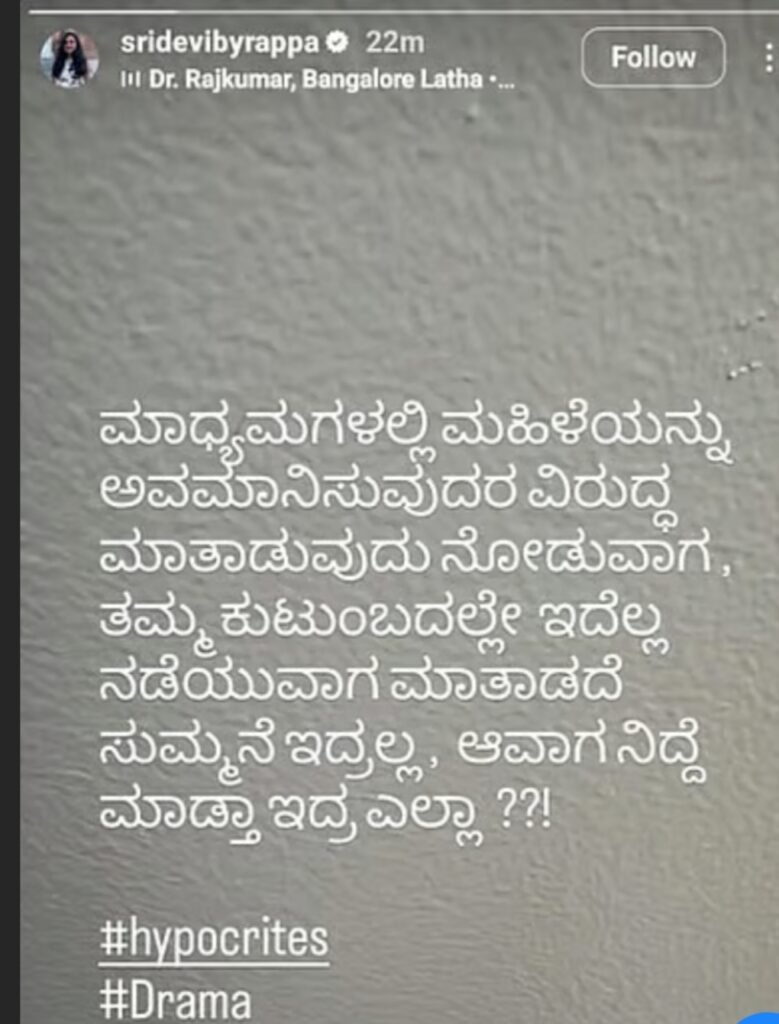 ಮಾಧ್ಯಮಗಳಲ್ಲಿ ಮಹಿಳೆಯರನ್ನು ಅವಮಾನಿಸುವುದರ ವಿರುದ್ಧ ಮಾತನಾಡುವುದು ನೋಡುವಾಗ, ತಮ್ಮ ಕುಟುಂಬದಲ್ಲೇ ಇದೆಲ್ಲ ನಡೆಯುವಾಗ ಮಾತಾಡದೇ ಸುಮ್ಮನೇ ಇದ್ರಲ್ಲ, ಆವಾಗ ನಿದ್ರೆ ಮಾಡ್ತಾ ಇದ್ರಾ ಎಲ್ಲ? ಎಂದು ಶ್ರೀದೇವಿ ಭೈರಪ್ಪ ಅವರು ಇನ್ ಸ್ಟಾಗ್ರಾಂನಲ್ಲಿ ಬರೆದುಕೊಂಡಿದ್ದು ಇದರ ಜೊತೆ ‘ಬೂಟಾಟಿಕೆ ವ್ಯಕ್ತಿಗಳು’ ಮತ್ತು ‘ಡ್ರಾಮಾ’ ಎಂಬ ಹ್ಯಾಶ್ ಟ್ಯಾಗ್ಗಳನ್ನು ಬಳಸಿದ್ದಾರೆ.