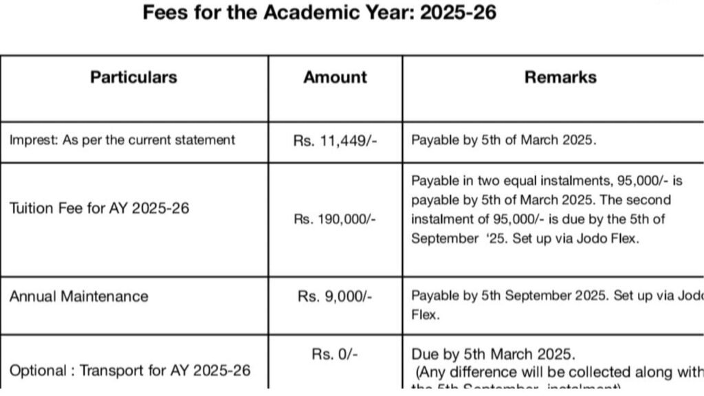 ವಾಯ್ಸ್ ಆಫ್ ಪೇರೆಂಟ್ಸ್ ಅಸೋಸಿಯೇಷನ್ ಹೆಸರಿನ ಖಾತೆಯಲ್ಲಿ ಶುಲ್ಕದ ವಿವರವಾದ ಮಾಹಿತಿಯನ್ನು ಹಂಚಿಕೊಳ್ಳಲಾಗಿದೆ. ಈ ಪೋಸ್ಟ್ ನಲ್ಲಿ ಬೋಧನೆಗಾಗಿ 1.9 ಲಕ್ಷ ರೂ, ವಾರ್ಷಿಕ ಶುಲ್ಕ ರೂ 9,000 ಹಾಗೂ “ಇಂಪ್ರೆಸ್ಟ್” ಅಡಿಯಲ್ಲಿ 11,449 ರೂ ಸೇರಿದಂತೆ ಒಟ್ಟಾರೆಯಾಗಿ 2.1 ರೂ ಶುಲ್ಕದ ವಿವರವನ್ನು ಕಾಣಬಹುದು. ಇದೀಗ ಬೆಂಗಳೂರಿನಲ್ಲಿ 3ನೇ ತರಗತಿಗೆ 2.1 ಲಕ್ಷ ರೂ ಶುಲ್ಕ ವಿಧಿಸಿರುವುದಕ್ಕೆ ಸೋಶಿಯಲ್ ಮೀಡಿಯಾದಲ್ಲಿ ಆಕ್ರೋಶ ವ್ಯಕ್ತವಾಗಿದೆ.